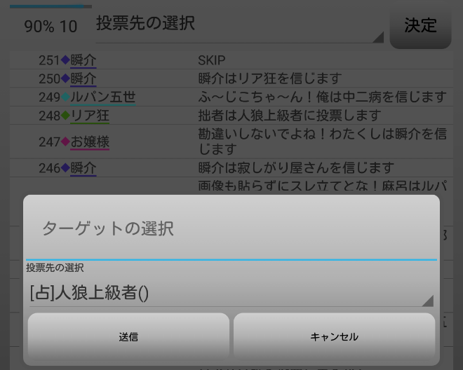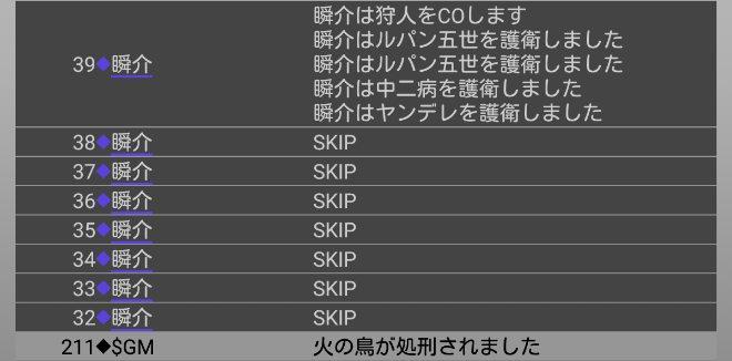 瞬介「今日も占い師吊りを続行だ。上手くやれば人狼上級者を吊れるかもしれない。俺はルパンと同じく『人狼上級者に投票します』」