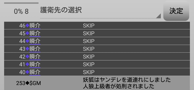 瞬介「ヤンデレ護衛を実行しました(下の図)。正直、AIが2回も狩人GJを出したところは見たことがないので護衛が成功するかは自信ありません」