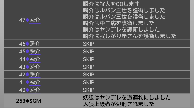 瞬介「おお!人狼上級者は妖狐だった!そしてヤンデレが背徳者!これで勝ちは確定しただろう。明日は狩人COをして勝負を決めるぞ!」