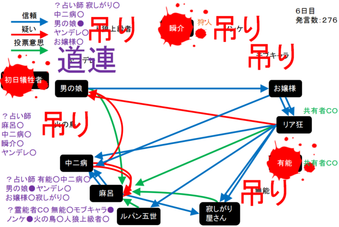 7日目は男の娘吊りになるだろう。その後に村人が正しい判断をしてくれれば勝てるのだ。みんな頑張って!それでは7日目よ来い来い!そいっ!