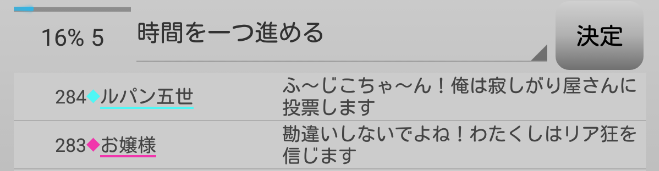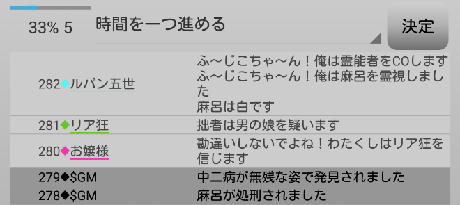 もうだめだあ。村人の結束が崩壊しておる。しかも人狼のお嬢様は疑われておらん。次に行きます。