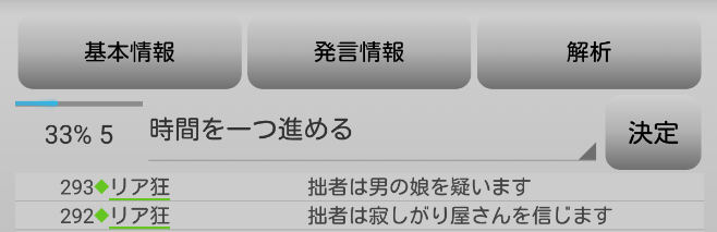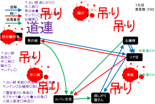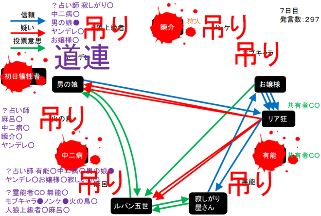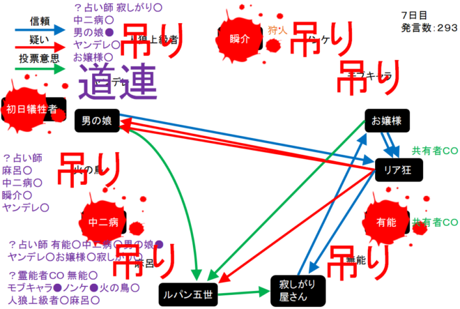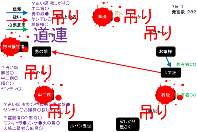リア狂は何を基準に判断しているんだろう。単純に●があるプレイヤーを疑っているんだろうか。次にいきます。