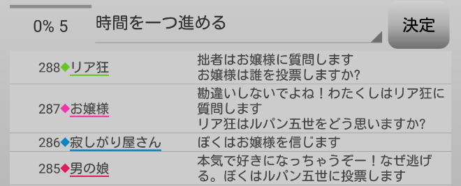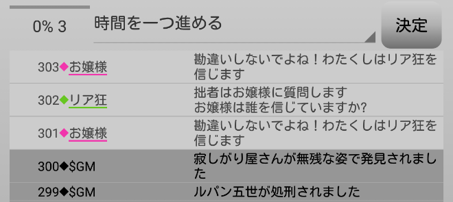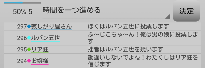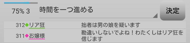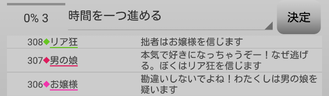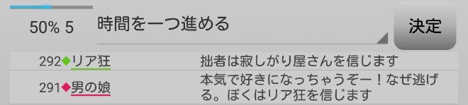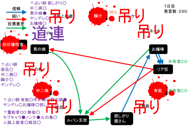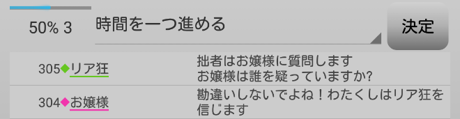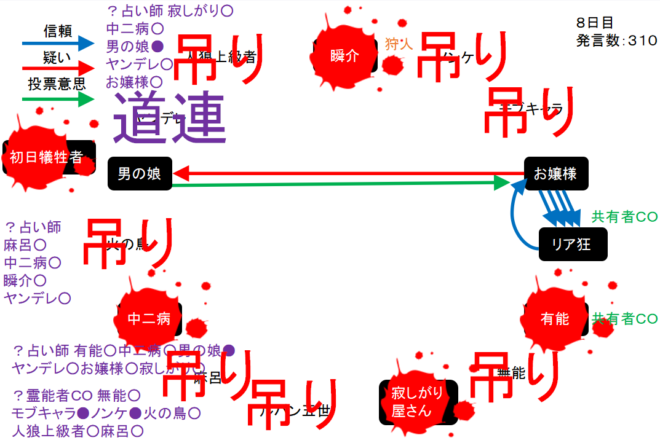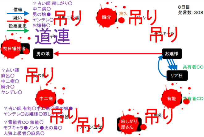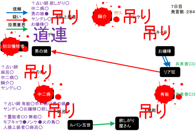 男の娘が疑われている。共有者のリア狂が寂しがり屋さんを信頼するかお嬢様を疑えばチャンスはある。次にいきます。