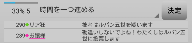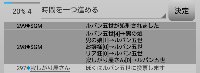 おや?さすがルパンだ。男の娘の●を人外からの●出しと見抜いたか。しかし、リア狂とルパンが別々のプレイヤーを疑っているのはまずい。吊りはあと2回だぞ。次にいきます。