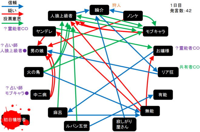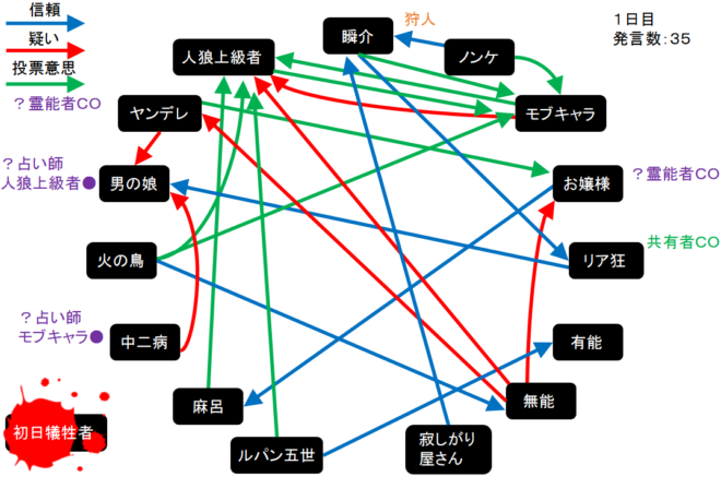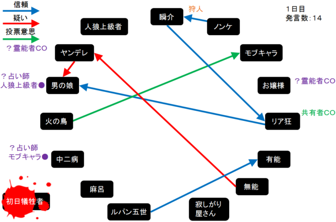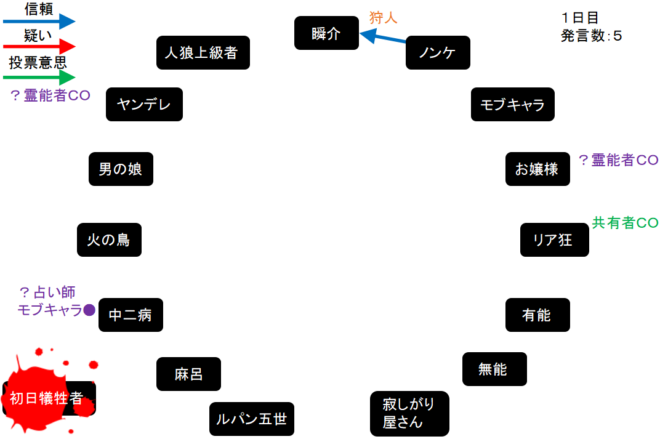 瞬介「今回の初日犠牲者は初日犠牲者さんです。狩人戦は1日目のCO結果が重要だ。真占い師や真霊能者が役欠けをしてもおかしくないのでね。さっさと1日目を初めてしまおう」