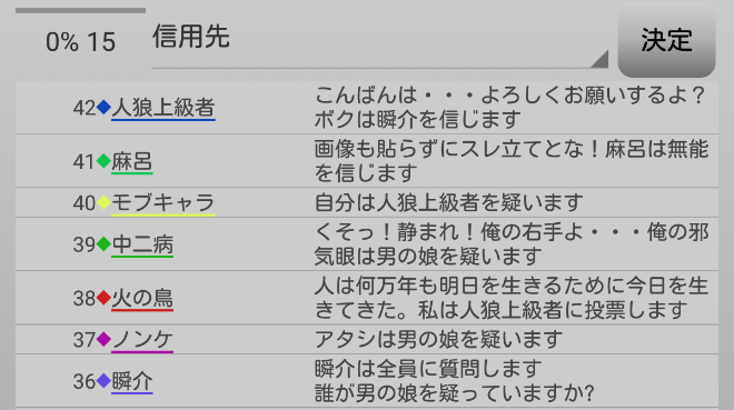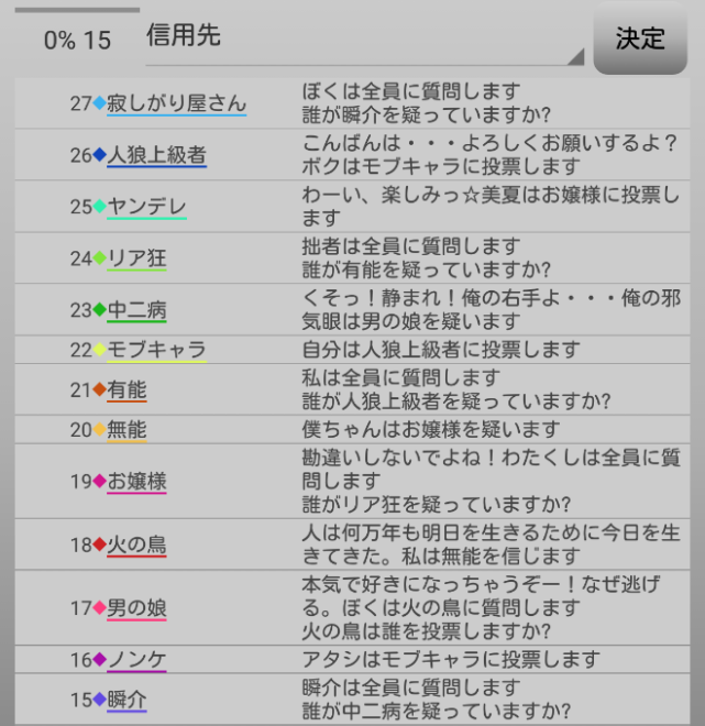 人狼2匹の正体は分かっている。『男の娘●、モブキャラ●』だ。人狼の駆逐は簡単そうなので妖狐を探そうか。占い師を疑っているプレイヤーを探そう。全員に聞きます『誰か中二病を疑っている人はいますか?』。