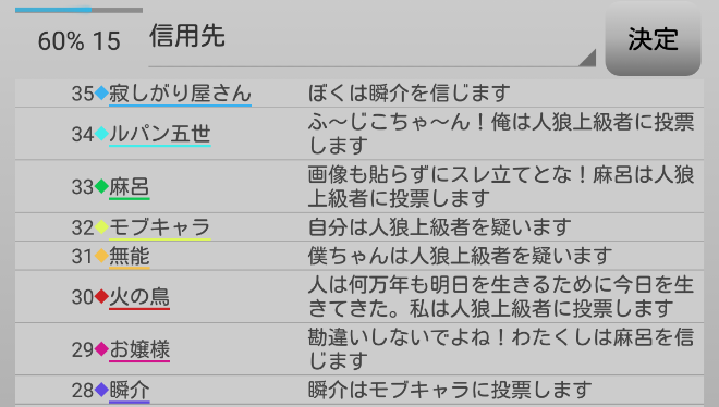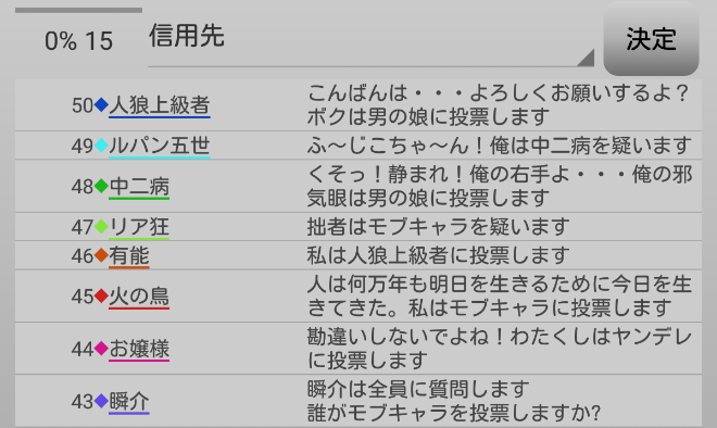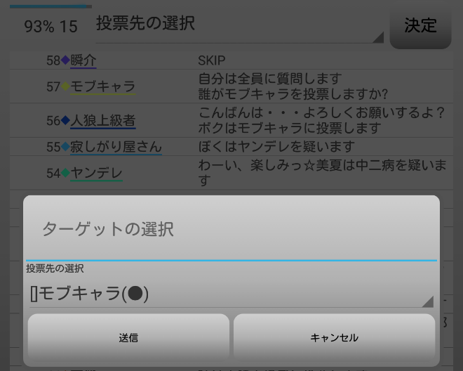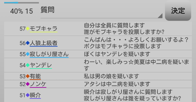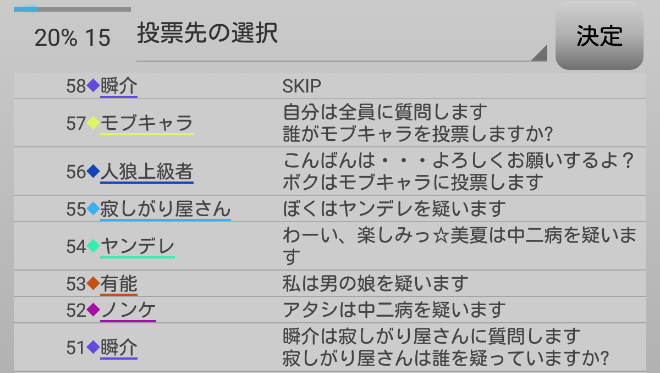 しかし、ここで真●のモブキャラ吊りの機会を逃すのは避けたい。モブキャラ投票者を募ろう。全員に質問をします!『誰かモブキャラに投票をする人はいますか?』」