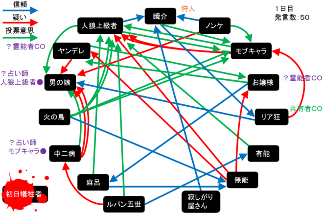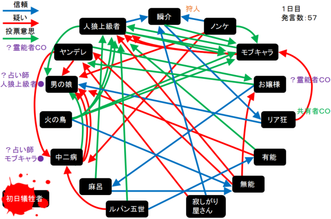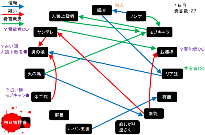 対抗占い師がいないので役欠け占い師なのかと心配してしまうよね?だけどヤンデレとお嬢様の2人が霊能者COをしているから、中二病は真占い師で、霊能者は狂信者と真霊能者が担っているのだろう。霊ロラで真霊能者は失ってしまうが護衛は真占い師を選択すれば良い。しかも1日目からモブキャラが真●だと判明している。これは・・・余裕かな?