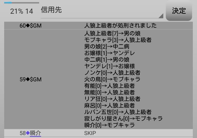 瞬介「連敗中だけど16D村の狩人は楽しいですね。霊ロラや●吊りが多いのでグレランで吊られる機会は少ない。ディフェンス(護衛)やオフェンス(狩人CO)をするタイミングを熟慮しなければ勝てないから緊張感がある。楽しい役職です」
