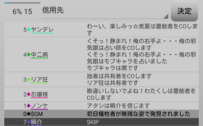 占い師に疑い発言を飛ばしている者が現れ始めてきた。真占い師の中二病さん!明日は呪殺を頼むよ?