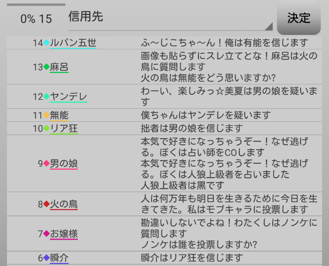 どうせ人狼上級者、モブキャラ、霊能者の2人は吊ることになるのだ。妖狐探しを優先させた方が良い。全員に質問します!『誰か占い師の男の娘を疑っている人はいますか?』。