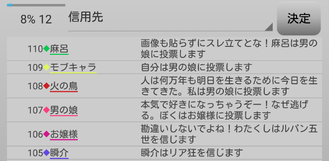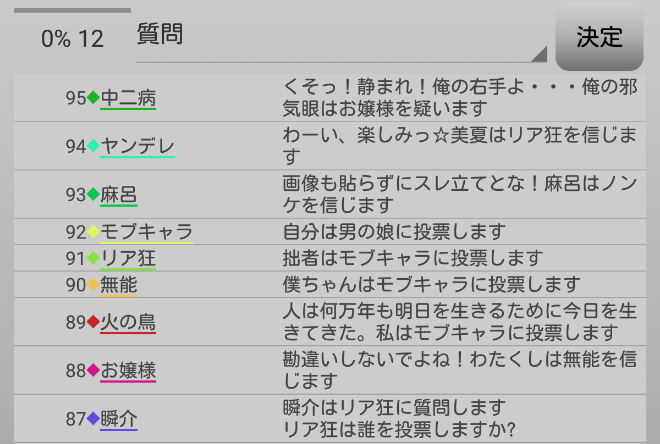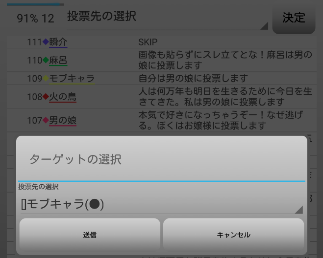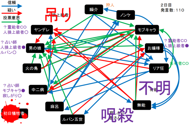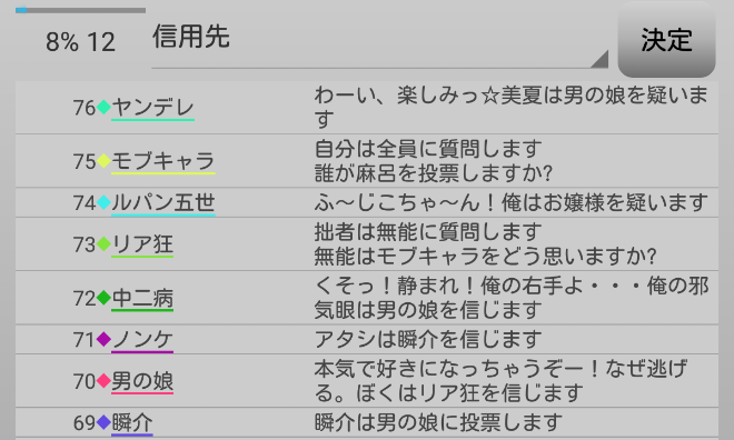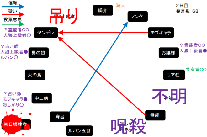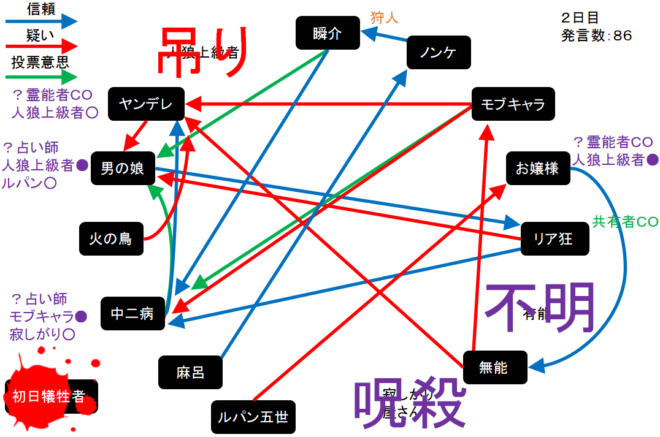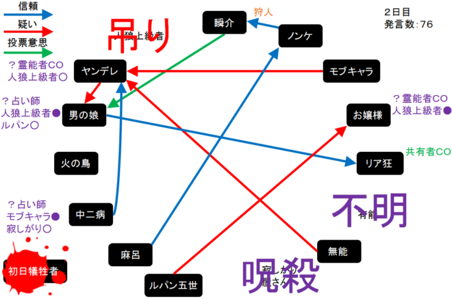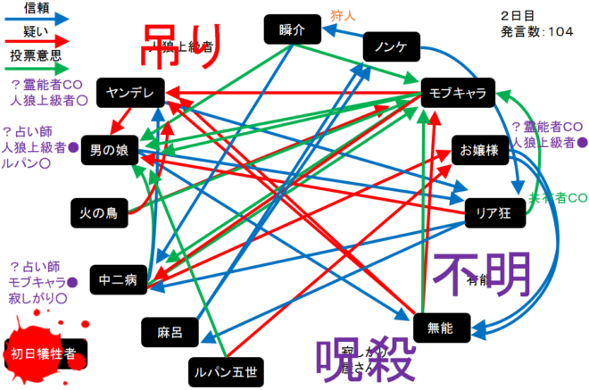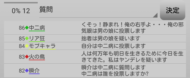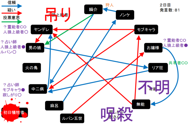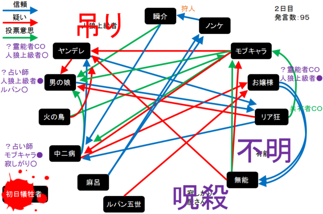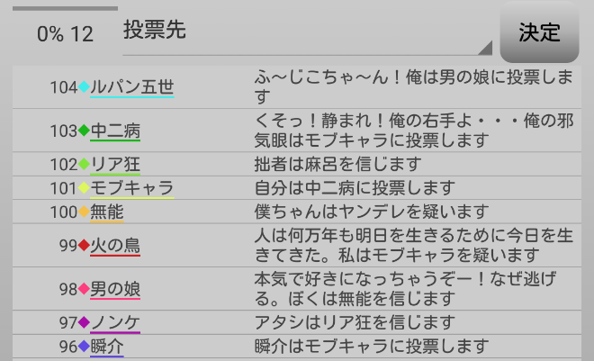 俺はノンケに不意打ちをくらって憤慨している。赤で囲んだプレイヤーは人狼(?)のモブキャラに投票、もしくは投票意思を示した者です。