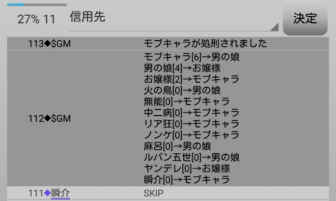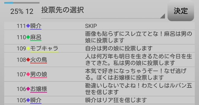 瞬介「議論はこれで終わり。投票の時間になります。共有者の意向に従って人狼の『モブキャラに投票』をしよう」
