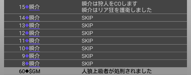 瞬介「リア狂のナイスな判断で霊ロラは中断。人狼のモブキャラ吊りの流れだ!俺は早まって破綻占い師へ投票をしそうになった」