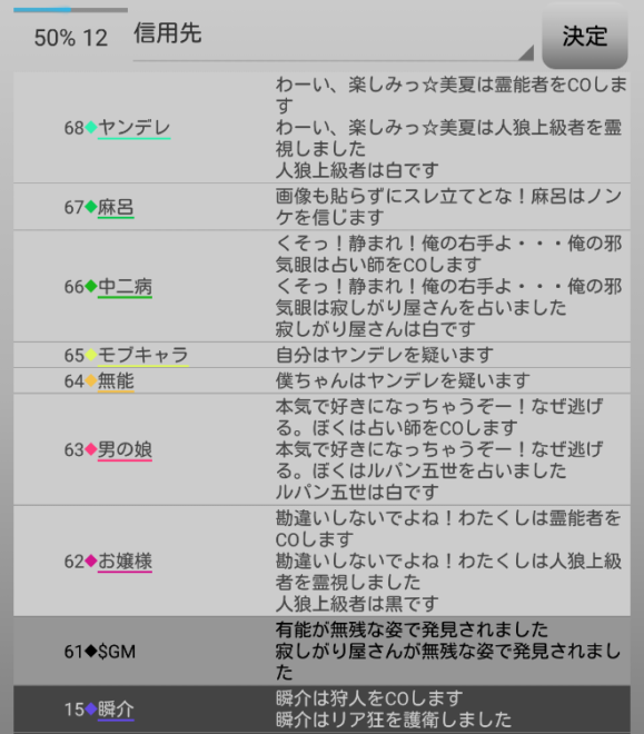 無事に人狼を吊れそうなので特に発言することはないが共有者を信頼しておこうか。俺は『リア狂を信頼しています!』。
