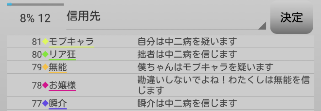 リア狂が中二病を信頼した。「中二病に投票先を質問→対抗男の娘に投票→リア狂に投票先を質問→リア狂も男の娘に投票」を狙ってみよう。『中二病は誰に投票をしますか?』。