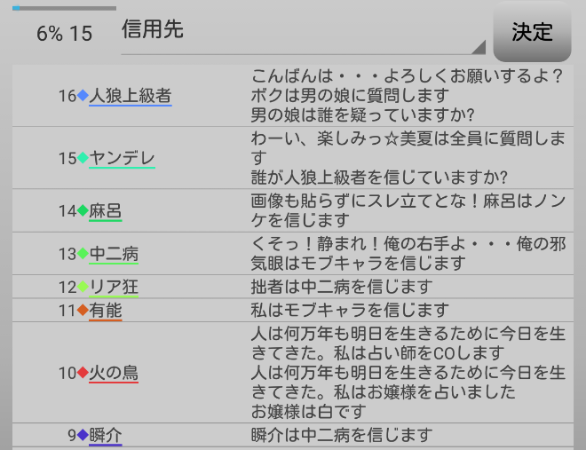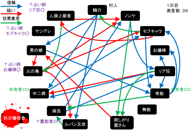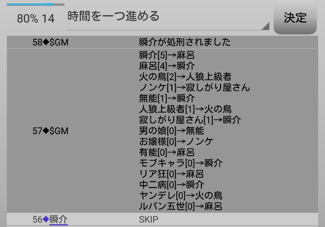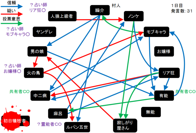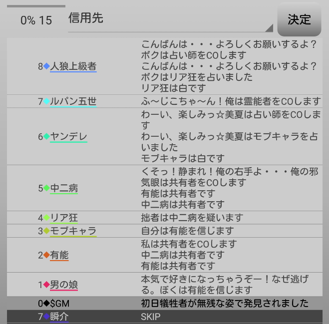 瞬介「占い師は人狼上級者とヤンデレがリア狂○、モブキャラ○でCO。配役は『真』-『狂』かな」