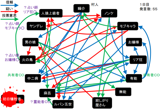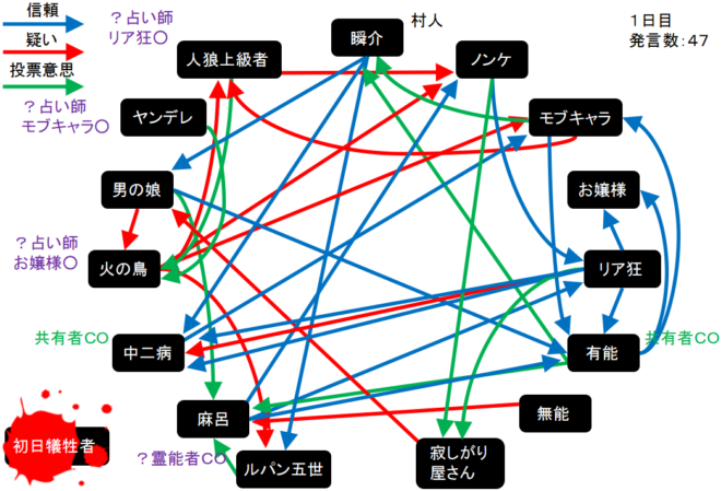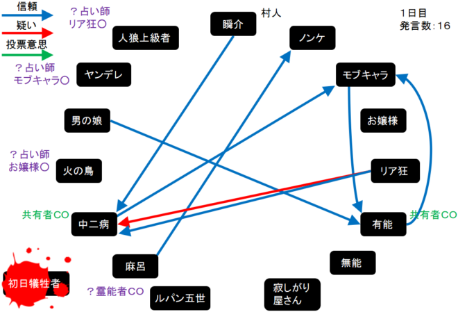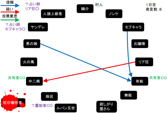 霊能者COをしているのはルパンだけなので真霊能者だろう。そして共有者は有能と中二病の2人がCOをしているのか。