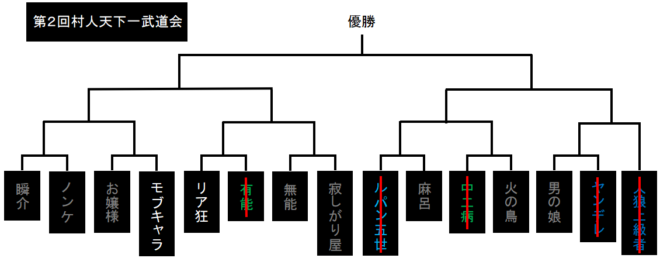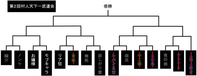 瞬介「役職COをしたプレイヤーは村人天下一武道会を失格となります。ええと?今のトーナメント表はどうなっているの?」