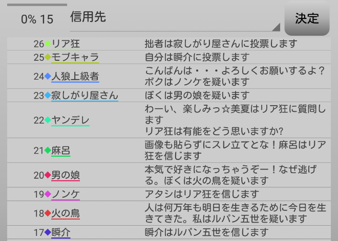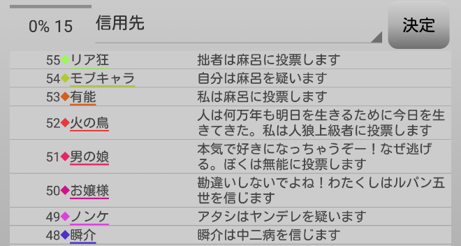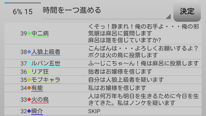 起死回生の一手は・・・麻呂に投票発言を飛ばしているルパンを信頼するか?もう1人の共有者である中二病から別の村人への投票宣言を引き出すか?それとも人外っぽいプレイヤーを信頼して味方につけるか?