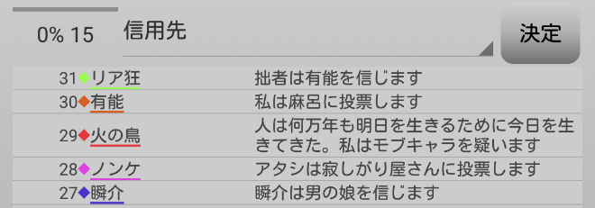 麻呂吊りに動いた有能を信頼すれば無事にやりすごせるだろうか?有能はあからさまな信頼発言を嫌うプレイヤーだからやめておこう。2票集まっている寂しがり屋さんを信頼して味方を増やそうか?