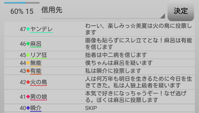 瞬介「プレイヤーを疑ってはダメだ。敵を増やしてしまうからな。火の鳥(人狼)を疑っている男の娘を信頼しておこう。俺は『男の娘を信頼しています!』」