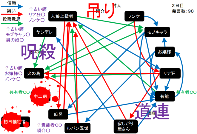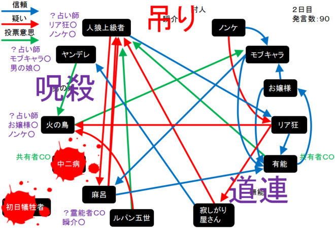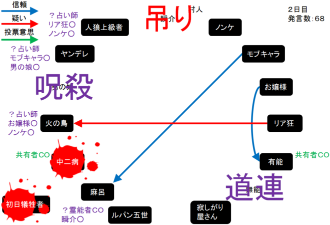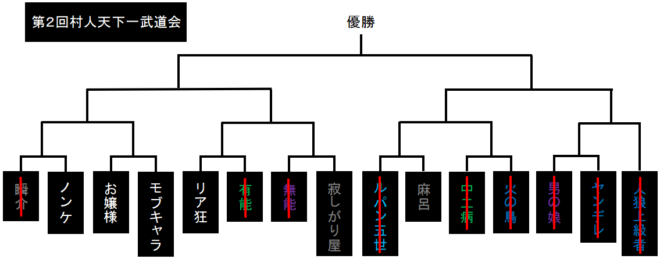 なんか凄いことが起きたぞ(笑)。ヤンデレが男の娘を呪殺した(笑)。残りの吊り回数は5回あるけど2回は破綻した偽占い師吊りに使うんだよね。現状を整理するためにトーナメント表を見てみよう。