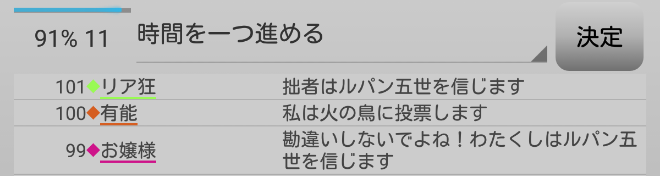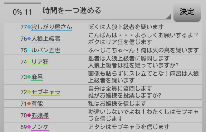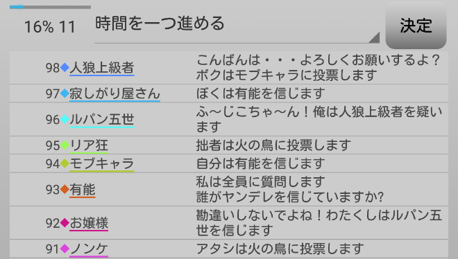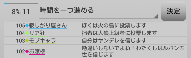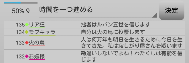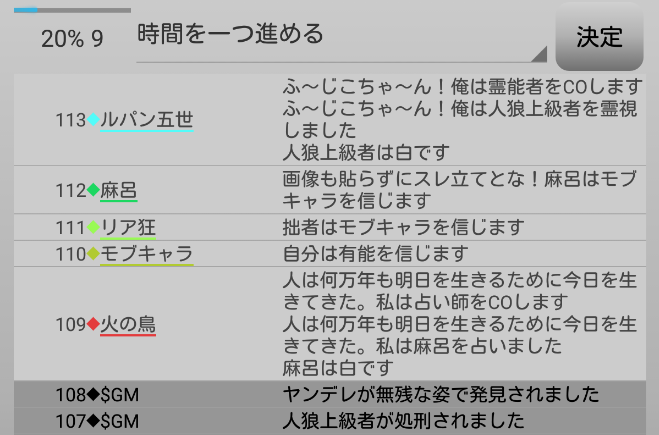 火の鳥が処刑された。まだ人狼は2匹いる。役職者の有能とルパンは噛まれるだろうから真○のモブキャラが頼りだ!