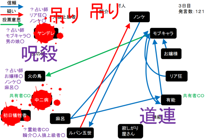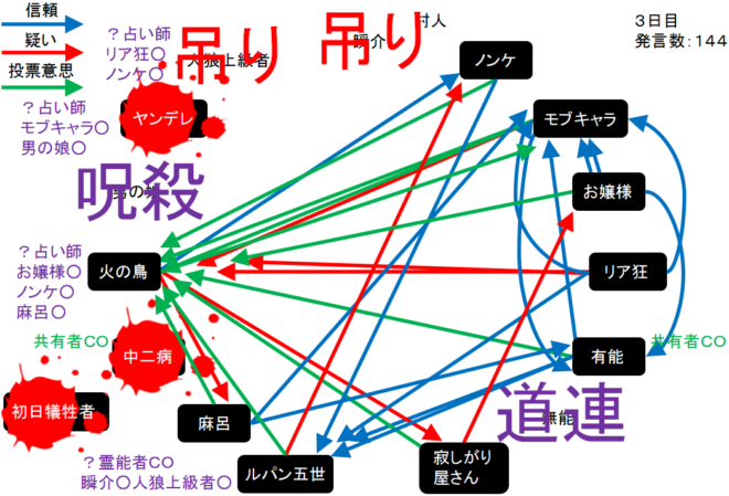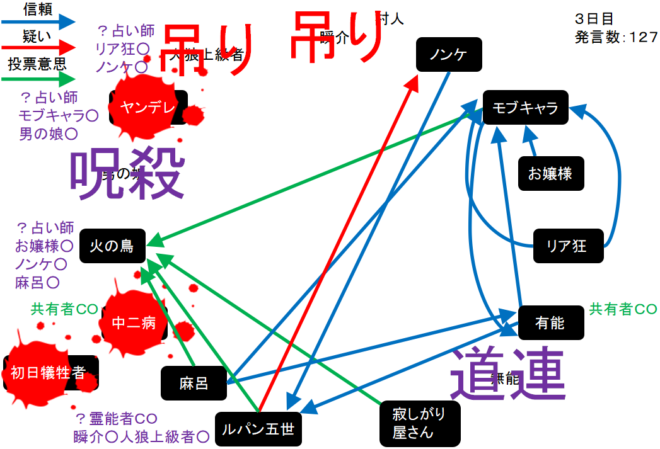 3日目は全員、火の鳥投票かな。狩人が生きていないかなあ!次にいきます。