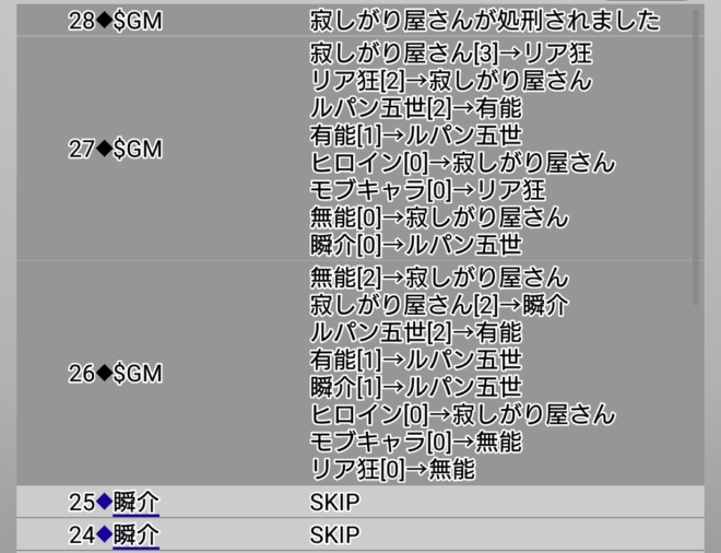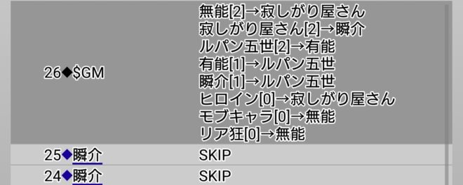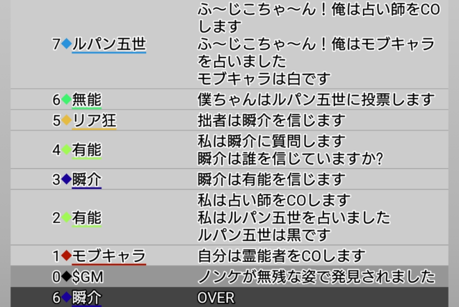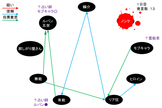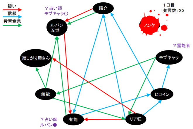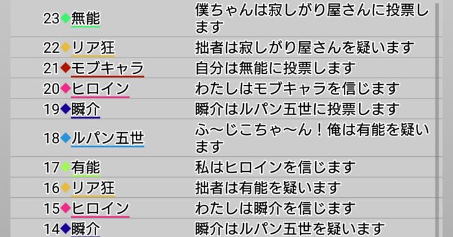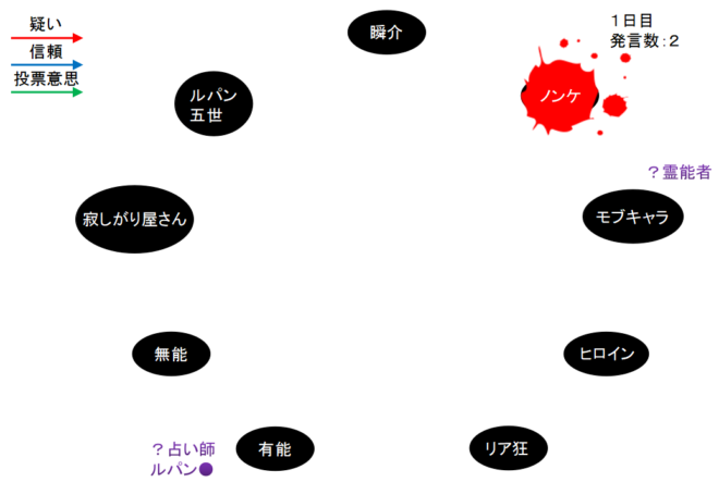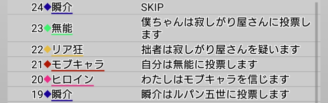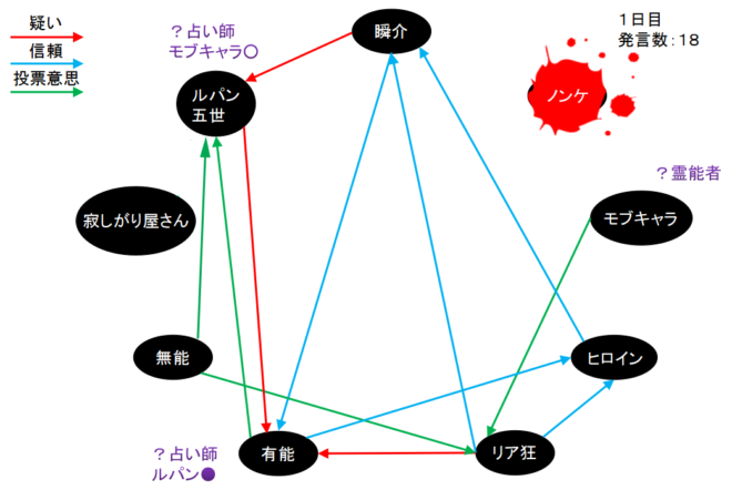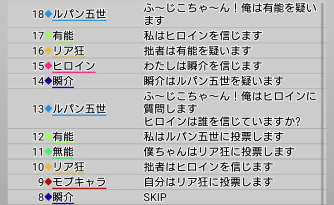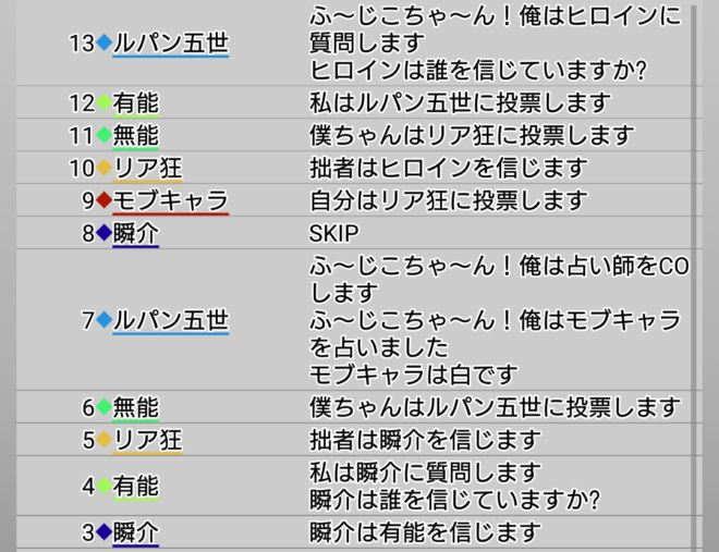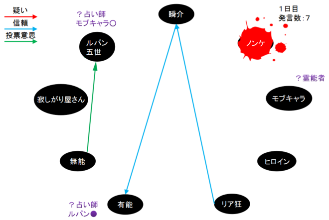 瞬介「もうルパンを人狼と見ているから投票宣言でも良かったんだけど、ちょっと周りの意見を聞いてみたかったんだ。有能支持派は『俺』と『ヒロイン』と『寂しがり屋さん』かな。モブキャラと無能がリア狂へ投票するのは有能を疑っているからか(笑)」