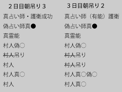瞬介「ん?あれ!?自分が作った図が怪し過ぎてわけがわからなくなってきた!と、とにかく占い師が2日目朝に噛まれるとまずいというのは分かった(笑)。だから3日目朝まで狩人が●出しをした占い師を護衛して3日目まで成功したとすると・・・」