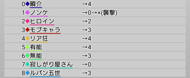 楽しんでばかりいたら人狼に翻弄されて負けてしまいそうだ(笑)。うーん、疑い発言がまだ無いな。そしてヒロインの発言も無い。どうしようかな。有能が人狼だとして、いきなり●出しすると有利になったりするんだろうか。●は吊られるだろうから次の日に偽占い師だというのはバレる。有能人狼が勝負にでて村人へ無作為に●を飛ばしたのだとすると。今回とは違いルパンの○が村人だったとして。