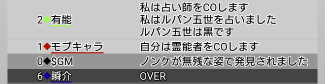 瞬介「あれ?有能がルパンへ●出しをしている。これは人狼にとって厳しいスタートではなかったかな?」
