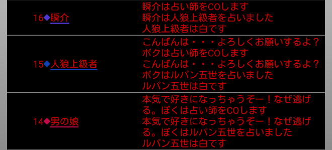 瞬介「ダメだ。2人とも占い師をやるつもりだ(上の図)。しかも同じルパン○のCO結果を作りやがって!」