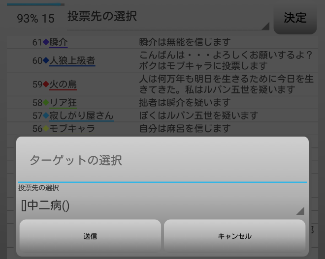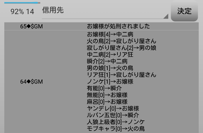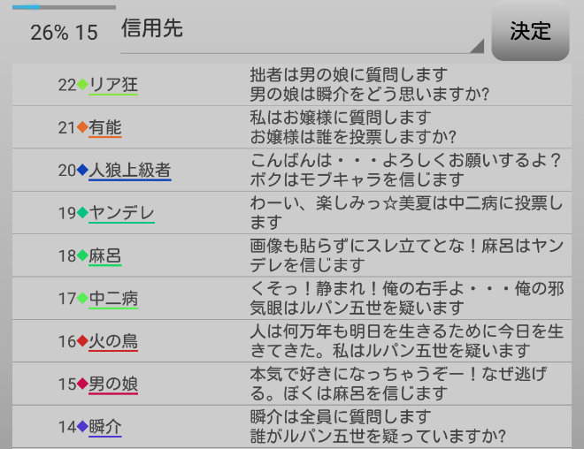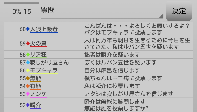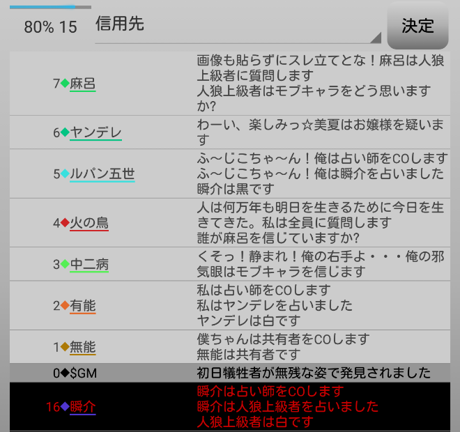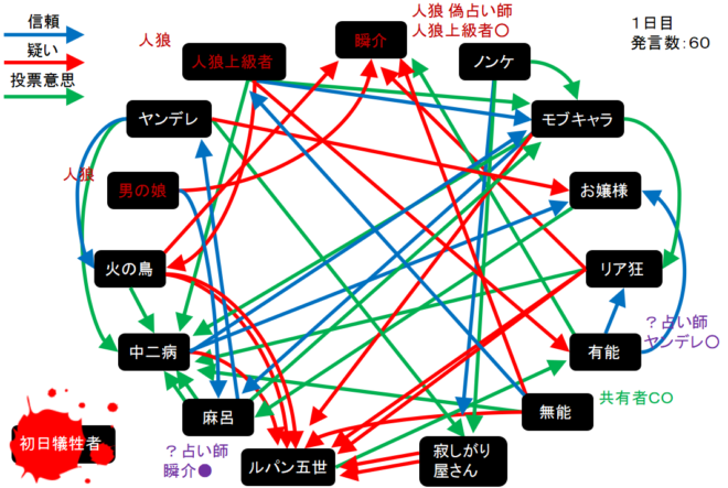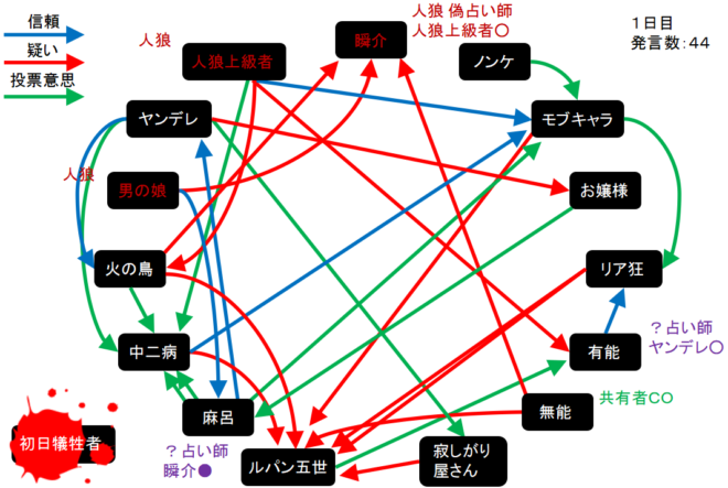 ちょっと状況を整理しようか。占い師の配役はルパン『真』、有能『狂信者』、俺『人狼』でしょう?そして無能が共有者で相方は潜伏中であると。