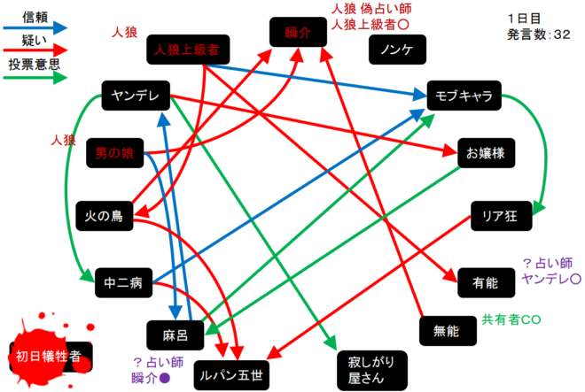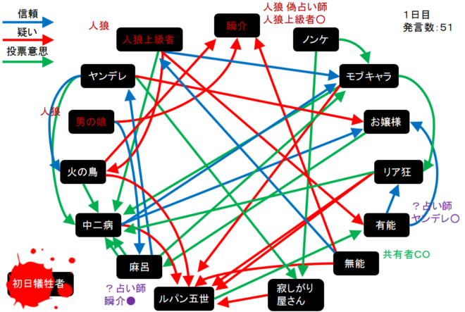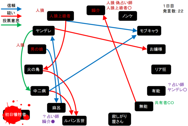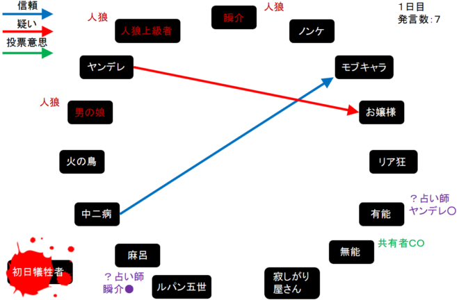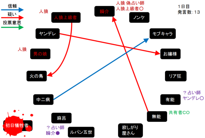 瞬介「人狼上級者○のCO結果を作って参った(上の図)!あとは狂信者が男の娘○の結果を飛ばしてくればベストだ。それでは!1日目よ来い来い!そいっ!」