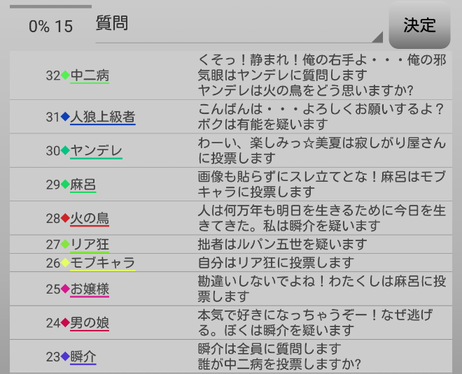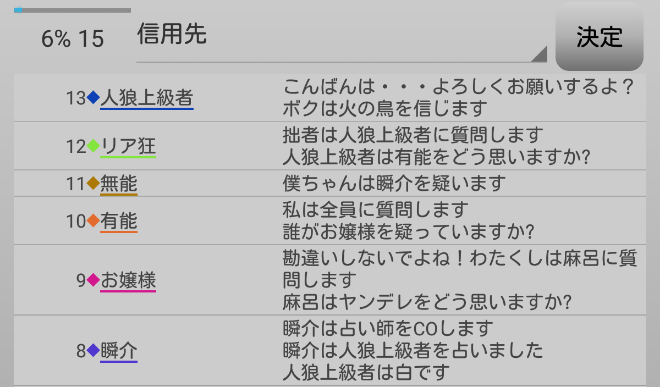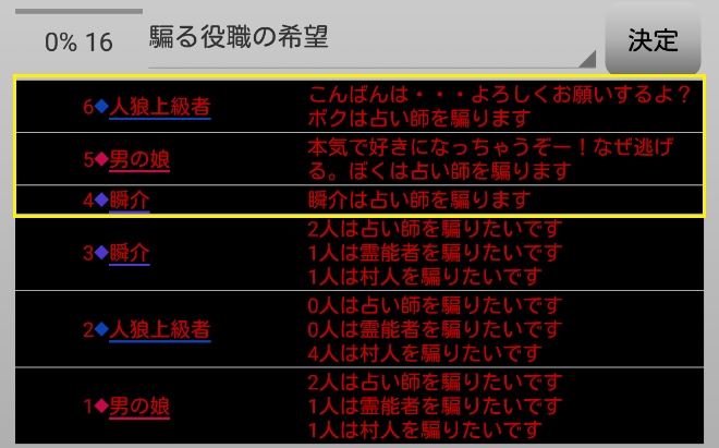 さて、各プレイヤーが担当する配役についてだが?もちろん俺は偽占い師を担当する。何度も真占い師をやったから立ち回りは忘れてしまったけどね(笑)。ゆえに担当は『占い師(俺)、霊能者(霊ロラ役)、潜伏人狼』にしたい。