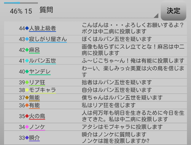 何か発言をしよう(笑)。妖狐でも探すかあ?誰か占い師の『ルパンを疑っている人はいますか?』。