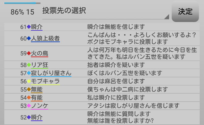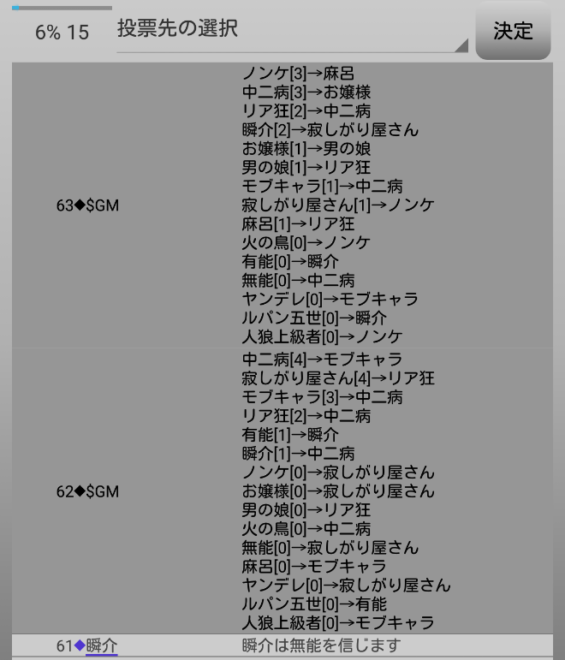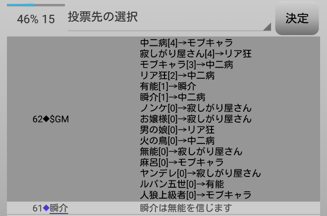 瞬介「無能に投票先を聞こう。無能が投票をした者は共有者ではないからね。『無能は誰に投票をしますか?』」
