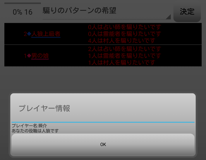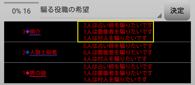 瞬介「これで占い師役と霊能者役が決まるはず。みんなの希望役職は何かな?」