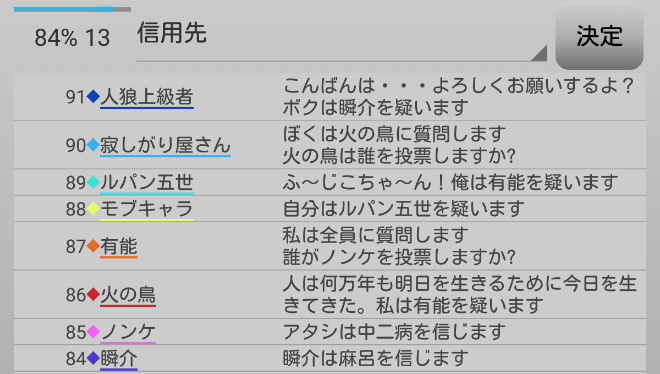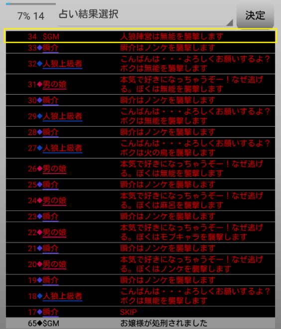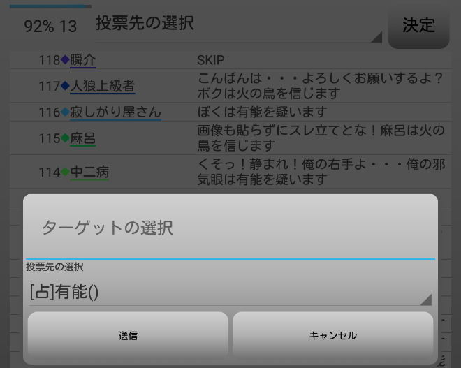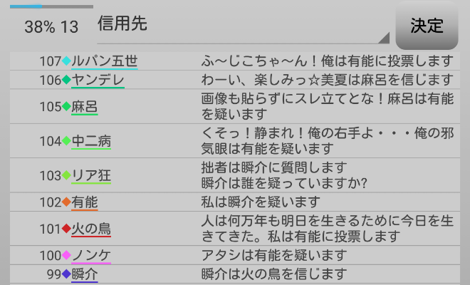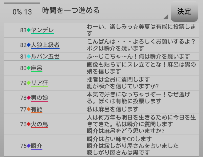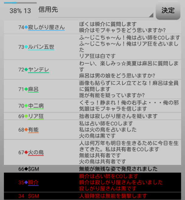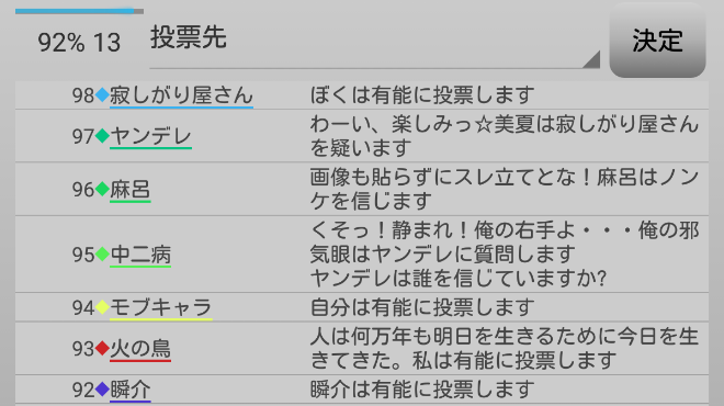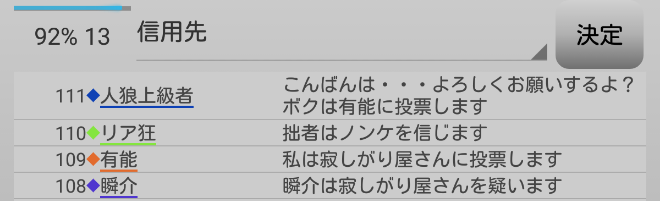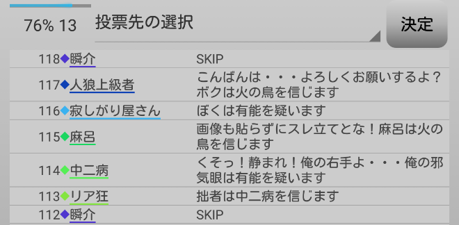 瞬介「俺も破綻占い師の有能に投票宣言をしよう。火の鳥への●出しは強気すぎた。だが火の鳥が妖狐ならば勝っていたから有能を責めることはできない。俺は『有能に投票をします!』」