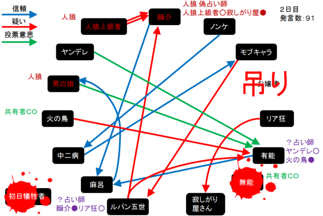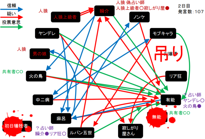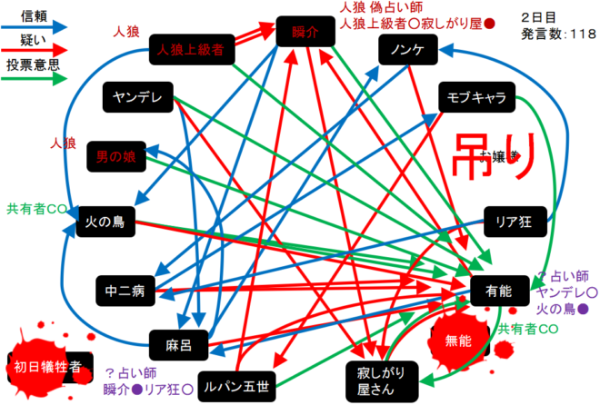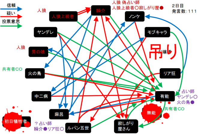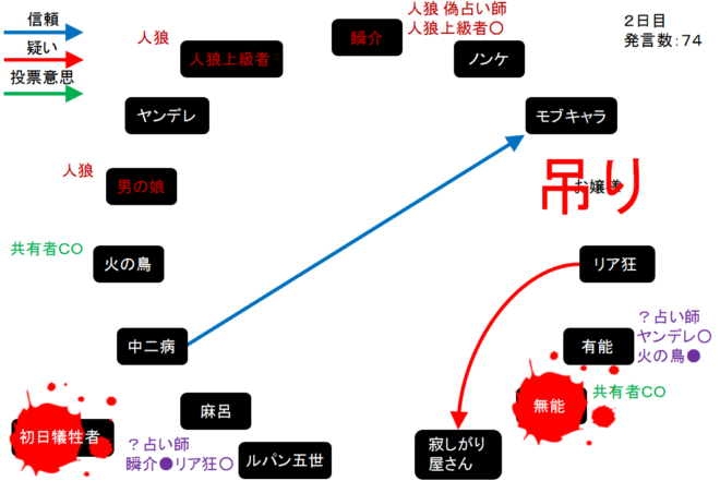 噛まれた無能の代わりに火の鳥が共有者COをしてしまった。そして狂信者(?)の有能が火の鳥●を出して破綻しているんですが?有能は何をやっているんだ!まあ、火の鳥が妖狐ならば狂信者の破綻と引き換えに葬ることができた。仕方ないね。