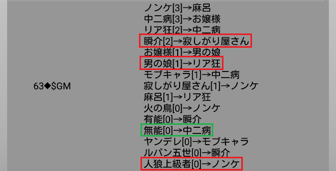 俺は頑張らなければいけない。赤で囲んだのは人狼による投票。緑で囲んだのは共有者の無能による投票です。