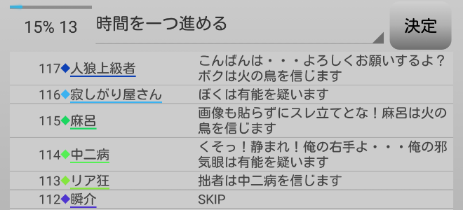 瞬介「あまり質問をすると真占い師ルパンに情報を与えてしまうことになる。呪殺は4~5日目らいまでに引き延ばしたいので発言はほどほどにしておこう。意思は示したので『スキップ』します!」