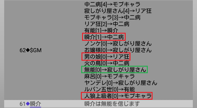 瞬介「●を出す候補は『中二病と寂しがり屋さん』の2択だ。寂しがり屋さんが男の娘へ投票をしているね。あとで投票先から推理されるのを防ぐために寂しがり屋さんに『●出し&吊り』をして葬ろう」