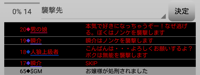 そして噛み先は?潜伏共有者は吊られそうになると議論中にCOをするだろう?投票意思を集めていた『中二病、モブキャラ』は共有者じゃない。人狼上級者がノンケに投票し続けていたのでノンケを噛みで消し去ってしまおう。推理の材料をなくしていくのだ。