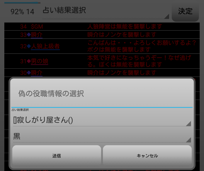 瞬介「今日は破綻した偽占い師の有能吊りになるだろう。占い結果を発表します!『寂しがり屋さんの占い結果は●でした!』」