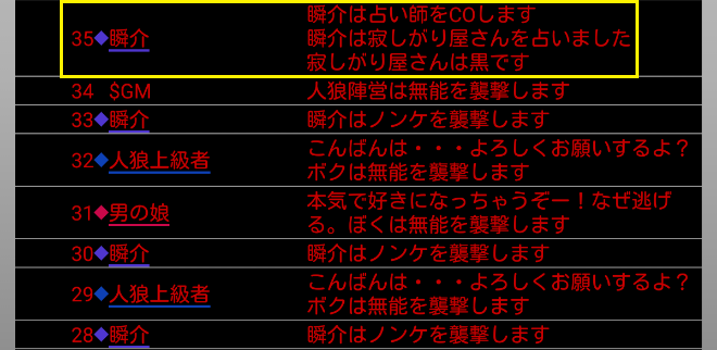 瞬介「リア狂から誰を疑っているか質問が来ているので答えよう。俺は●を出した『寂しがり屋さんを疑っています!』」