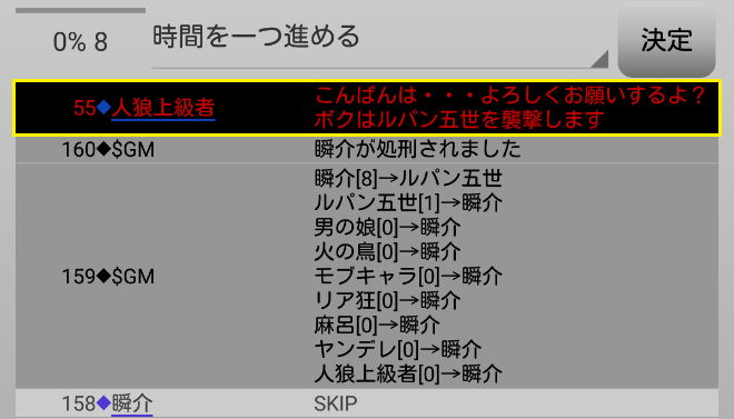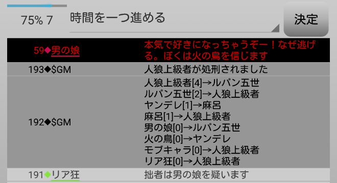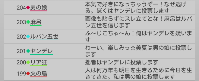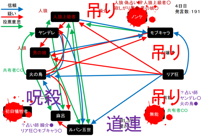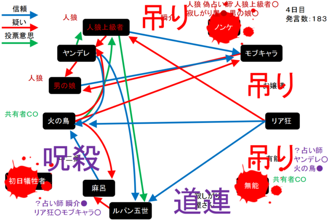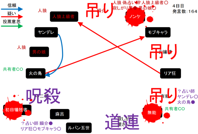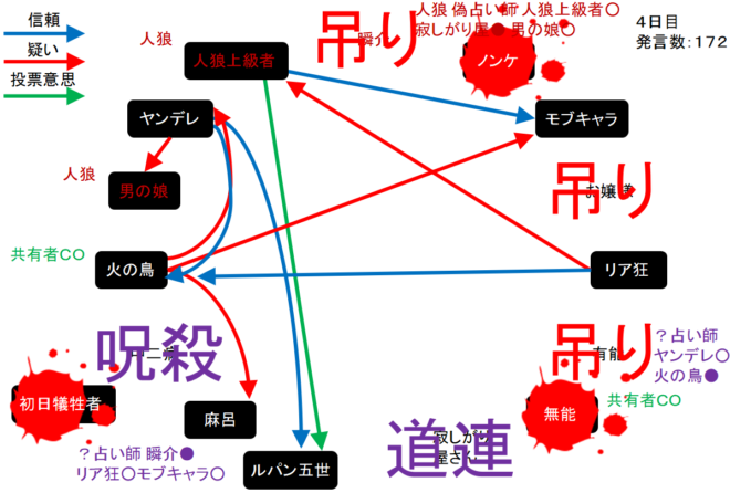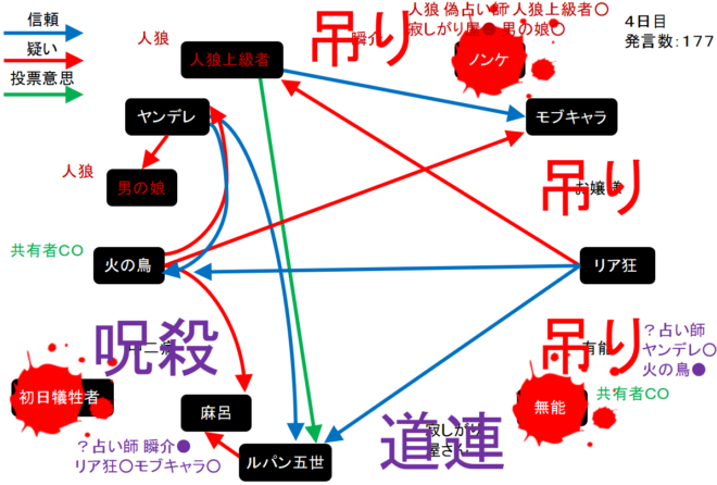 人狼上級者がルパン噛みを提案した(上の図)。これで成功しなかったら敗北するだろう。ルパンを噛んでも共有者の火の鳥と真○のリア狂が生存している。うーん、厳しいなあ(笑)。