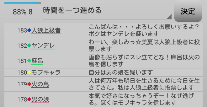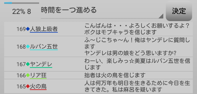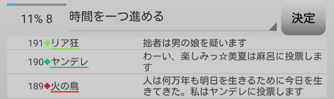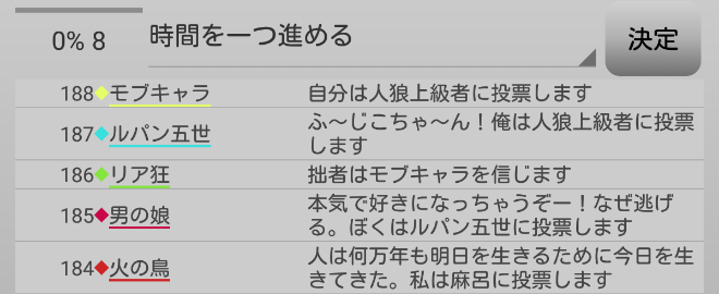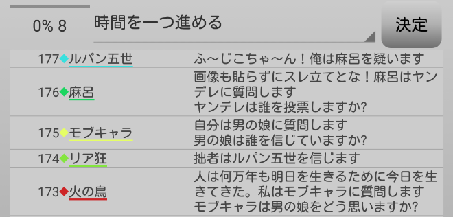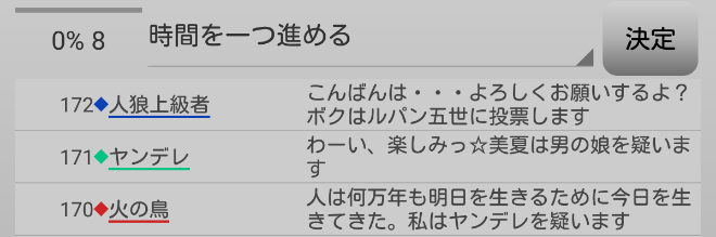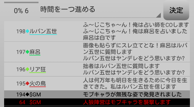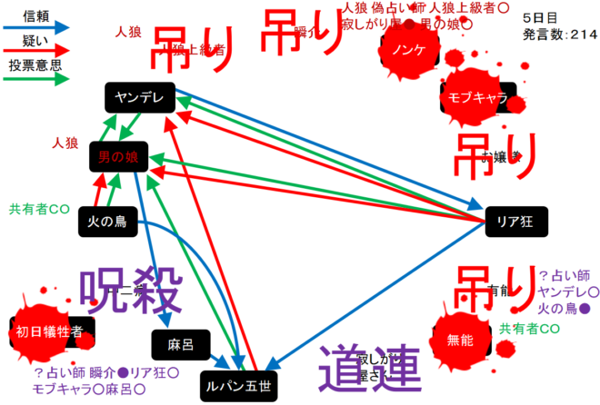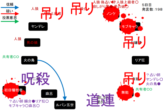 吊り回数は2回、吊り対象2人で真占い師が生存していますので議論を飛ばします。すみません。次回のアイキャッチを作るのに時間がかかりそうなのです。議論を5日目の最後まで時間を進めます。